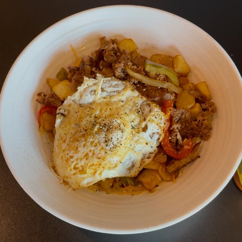 Everything you could want for breakfast in a bowl! Roasted potatoes topped with sautéed peppers and onions, cheddar jack cheese, shaved steak, and a fried egg! Need some hot sauce with that?